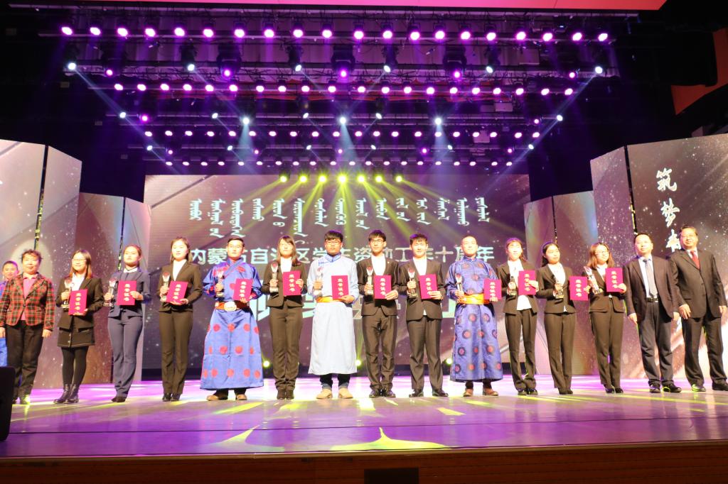 1226日晚,由自治区教育厅主办的“十年助学路,筑梦青春行”自治区学生资助工作十周年颁奖典礼在内蒙古艺术学院演艺厅隆重举行。自治区党委常委、宣传部部长白玉刚出席。自治区党委教育系统工委书记、高校工委书记,教育厅厅长、党组书记侯元致辞。 我校副校长铁勇、学生工作处处长冯福林、学生工作处副处长兼学生资助管理中心孟海光、学生资助管理中心奖学金管理科科长郭晓飞及56名学生代表参加颁奖典礼。